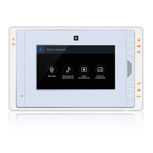 Монитор индивидуальный Touch Screen 7" разрешение 800×480, c памятью на SD карту, с возможностью подключения системы безопасности; Видеоинтерком между домофонами; Фоторамка; Проигрыватель видеофайлов; Умный дом; Поддержка SIP протокола. Питание +12 В (БП в комплекте), Размеры 257×158×28,5 мм. Цвет корпуса: белый.