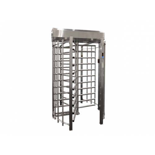 Турникет полноростовый однопроходный, корпус и ротор - полированная нержавеющая сталь, угол между поводками 90 градусов . Для использования в помещении. В комплекте: контроллер турникета, блок питания, пульт 114.021.